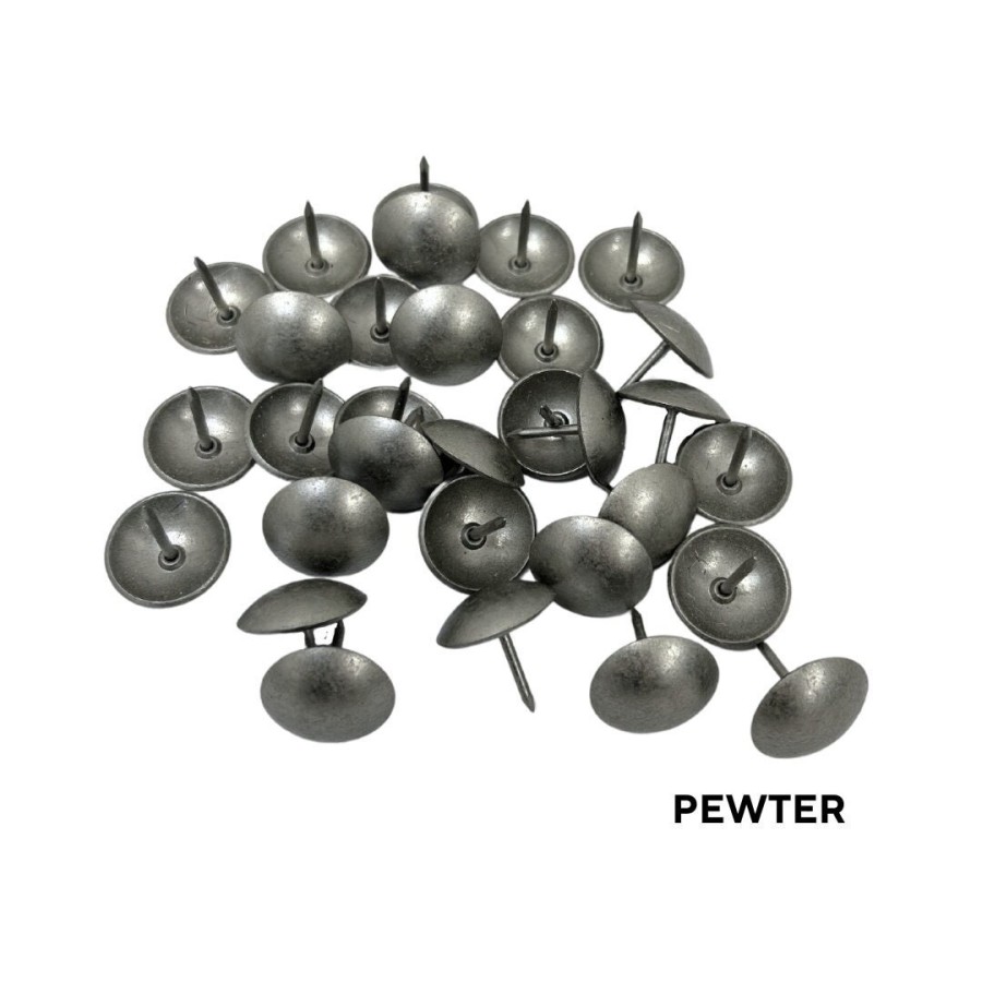 Oversized upholstery nail heads | 21mm diameter | Various finishes available Decorative and functional - these nailheads are ideal for decorating your furniture, DIY, and craft projects. These upholstery nail tacks have a length of 21mm and a round head diameter of 21mm. Great for use on thick materials like leather. Easy to install. Available in 3 main colours: > Pewter (satin silver) - 21mm diameter >Antique brass - 21mm diameter > Matte Black - 18mm diameter